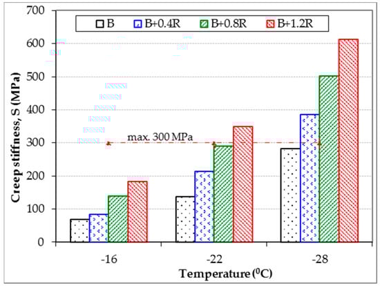Creep stiffness (S) and creep ratio (m-value) values, which are considered as performance parameters of bitumens exposed to very low temperatures, were obtained by using a BBR tester. The BBR results of the neat and modified bitumens at different temperatures were obtained 60 s after the start of the test, and these results are given in Table 7. In addition, the relationships of these parameters with temperature are given in Figure 15 and Figure 16.