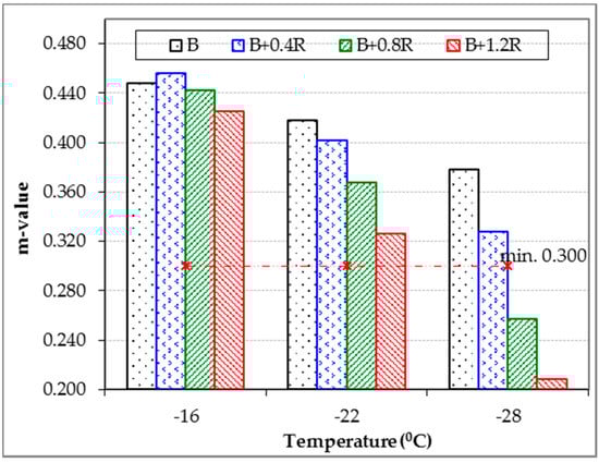 As seen from Table 7 and Figure 15, the stiffness of modified bitumens increased at low temperatures due to the increase in the amount of Elvaloy®RET. This means that bitumens containing Elvaloy®RET exhibit a more rigid behavior. However, as seen in Figure 16, the m-value values decreased with the increase of the additive rate. This means that there is a relative increase in the hardening speed of the Elvaloy®RET-modified binders exposed to low temperatures. According to this result, it can be stated that cracking at low temperatures may occur in these binders. Tiis is because the rapid change in hardness due to the low temperature can create cracks in the binder under the accumulated thermal stresses.