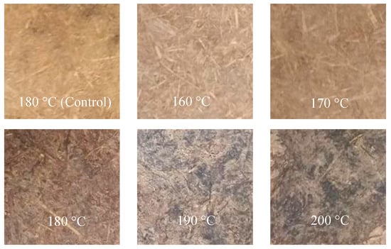 The manufactured fiberboards exhibited smooth surfaces [36], and the degree of surface darkening (Figure 1) with evaluated treatment temperature corresponded well with previous research [37]. This benefited primarily from the chemical modification of the wood constituents and the transference of the extractives [37]. According to other studies, the intensity of thermal degradation was directly related to the intensity of surface darkening, and was explained by hemicellulose hydrolysis and an increase in acid-insoluble lignin [38]. Similar fiberboards have been produced from unripe coconut husks, with high levels of hydrolysis in the biomass and the modification of chemical components in the process of hot pressing [39].