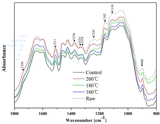 Functional group analysis of the FT-IR spectrogram was based on the work of George and Mclntyre [47]. The FT-IR spectra bands were predominantly assigned to cellulose, hemicellulose, and lignin, which are the major components of straw wheat. The IR spectra of the raw materials, controlled fiberboards, and boards with effluent under different hot-pressing temperatures are illustrated in Figure 2. The results of the FT-IR showed two special sections (not presented) that could be identified: (i) the functional section in the 3800–2700 cm−1 range, assigned to different C–H stretching vibration groups and O–H stretching absorption [48], and (ii) the fingerprint section, from 1800–800 cm−1, assigned to different stretching or bending vibrations of the functional groups of biomass components. After hot-pressing treatment, several significant changes in peak intensity could be observed in the spectra of fiberboards at 1739, 1376, 1335, 1319, 1241, 1162, 1110, and 900 cm−1. Absorbance bands with the wave numbers of 1000–1200 cm−1 were characteristic of C–O vibration of cellulose and xylan. With the increase of temperature, there was a shift of the C–O carbonyl band at 1739 cm−1 and the C–O absorption band at 1241cm−1. This finding indicated that more hemicellulose was hydrolyzing, and that there was an increase in the hydrolysis of aldehyde compounds such as hydroxymethylfurfural and furfural. Recently, some researches have demonstrated that the characteristics of lignin as a plastic material could improve the mechanical performance of binder-free fiberboards [19,49,50,51]. The initial lignin content of the boards at different pressing temperatures were mostly identical to that shown in Table 1; as such, it was reasonable to assume it would display almost the same peak intensity at 1511 cm−1, derived from the aromatic units in lignin. Consequently, the peak at 1511 cm−1 was used as a constant standard to derive the relative absorbance of fiberboards with effluent, which differed from the boards without effluent and raw materials. Furthermore, the spectra at 1376, 1162, and 900 cm−1 were more significant under higher hot-pressing temperatures. The change at 1162 cm−1 was supposed to generate new ether linkages resulting from the reaction between hemicellulose by-products and lignin during the hot-pressing process, which was the lignin–carbohydrate complex (LCC). The increased intensity at 1376 and 900 cm−1 could be attributed to the polymerization of glycosidic components among low-molecular carbohydrates [52]. These linkages could enhance the self-bonding strength of boards without adhesion. The effluent also contained proteins, as shown in Table 2. The main vibration bands of the proteins were at 3300, 3100, 1690–1600, 1575–1480, 1301–1229, 767–625, 800–640, 606–537, and 200 cm−1. However, the typical vibration bands were not identified in overlapping sludge spectra [53]. Overall, the differences among the FT-IR spectra of samples at varying pressing temperatures were not significant. This result suggested that the chemical changes that occurred were either few or infrared-inactive during the hot-pressing process.