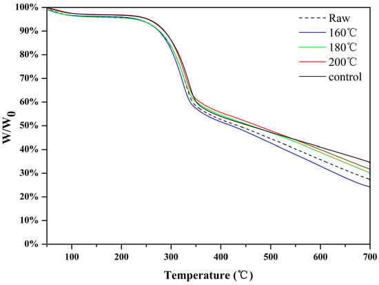 The pulp fibers were mixed with 10 wt.% pulping effluent. The boards were shaped from the mixture manually using a forming box (300.0 mm × 300.0 mm), with a target thickness of 1.5 mm and a target density of 1000 kg/m3. After the boards were shaped, the mats were dried to 30% moisture content and pressed at a pressure of 7.5 MPa for 4 min under different temperatures (160, 170, 180, 190, and 200 °C) in triplicates. Meanwhile, three panels without pulping effluent were produced under 180 °C as the blank control group. After the thermomechanical process, all specimens were stored in a conditioning chamber at 20 °C with a relative humidity of 65% to reach an equilibrium state.
