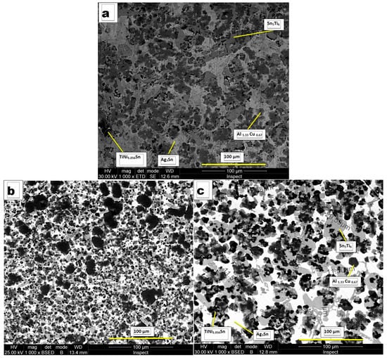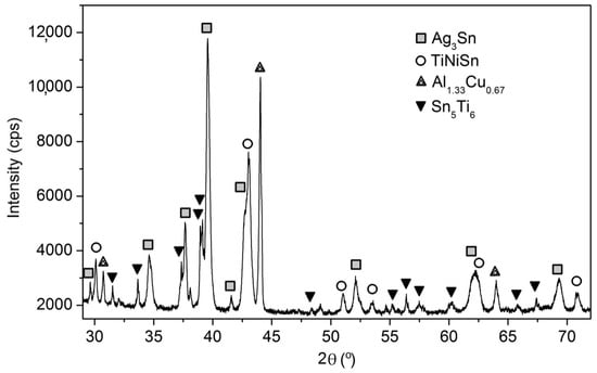 The phases occurring in the multi-component alloy have been identified in all three processing stages (as cast sample, thin cast strip, and heat treated) both by diffraction and differential thermal analysis (DTA) It has been noted that the Ag3Sn phase represents the dendritic matrix in which the other phases are present, having different dimensions and morphologies. Thus, the TiNi1.056Sn phase is in the form of dark compounds, surrounded by the Sn5Ti6 phase, having the appearance of gray islands with different sizes (11 to 30 μm) and different shapes (rounded or elongated). The Al1.33Cu0.67 phase has well-defined shapes, with quasi-rectangular faces, and average dimensions between 4 and 10 μm.