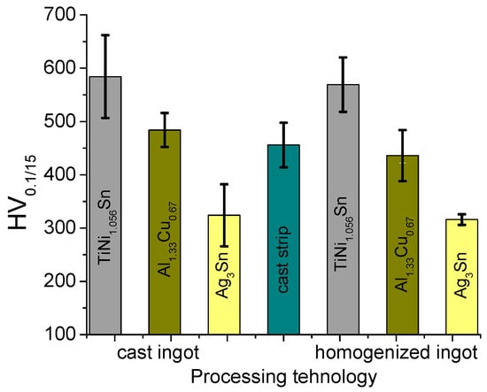 Figure 5. For the cast and the homogenized samples, the microhardness was determined separately for each phase. Due to the finer structure of the cast strip, only the global microhardness of this sample was determined.