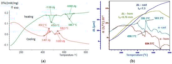 The thermal analysis was performed using the dilatometer L75/230-LINSEIS (DIL-Linseis Messgeräte Gmbh, Selb, Germany) and STA-449F3 Jupiter (Netzsch-Geratebau GmbH, Selb, Germany). The DIL (Dilatometer) and DTA (Differential Thermal Analysis) results are presented in