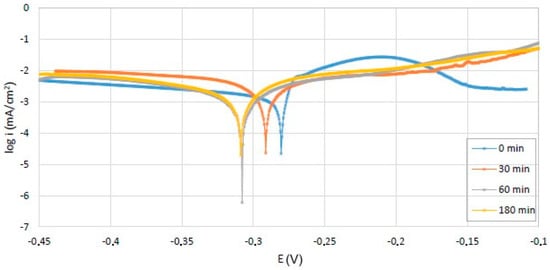 The corrosion behavior was studied in a 3.5% NaCl solution, using a BioLogic SP-150 potentiometer and a 3-electrode cell (Bio-Logic Science Instruments, Seyssinet-Pariset, France). The Tafel diagrams recorded for different corrosion intervals are shown in