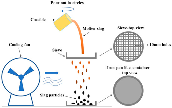 In this experiment, ten samples were obtained by mixing powders of limestone, fly ash, SiO2 reagent and MgO reagent in accordance with Table 3. The samples in corundum crucibles were heated in the furnace from room temperature to 950 °C at the rate of 10 °C/min and kept for half an hour at 950 °C for the fully decomposition of limestone powder, then continually heated to 1450 °C at the same rate and kept for half an hour at 1450 °C to melt the sample and homogenize the chemical compositions. Afterwards, the liquid molten slag was taken out of furnace, immediately poured out in circles manually passing through a disc iron sieve with 10 mm bore diameter to granulate the slag. At the same time, the molten slag was air quenched by a fan to obtain glassy structure. The solid slags are collected by an iron pan-like container. The schematic diagram of lab-scale air quenching process is shown in Figure 1.