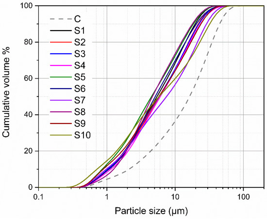 To study the hydration property of synthetic slag in cement system, ten air quenched slags were blended with cement at a slag/cement ratio of 1:1 to produce cementitious binders, which were designated as CS1, CS2, CS3, ..., CS9, CS10, respectively. The neat cement binder (designated as C) was also prepared and used as a reference. All slags were ground in a ball mill to achieve similar fineness and the particle size distribution (PSD) and Blaine specific surface area of air quenched slag powders are shown in Figure 2 and Table 4. The cement used in the experiment was Portland cement (P.I 42.5R). The chemical and mineralogical compositions of cement (wt.%) were as follows: SiO2-21.65, Al2O3-4.05, Fe2O3-2.73, CaO-64.14, MgO-1.81, SO3-2.64, Na2Oeq-0.66, f-CaO-0.60, LOI-1.71, C3S-58.78, C2S-21.38, C3A-6.49, C4AF-8.77 (C = CaO, S = SiO2, A = Al2O3, F = Fe2O3). The PSD and Blaine specific surface area of cement is also given in Figure 2 and Table 4.