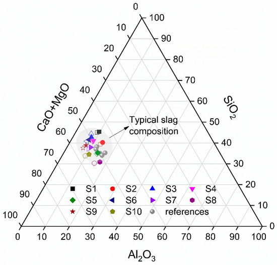 To compare the main oxides of slags further, the chemical compositions of synthetic slags in the ternary system of (CaO + MgO)-SiO2-Al2O3 are depicted in Figure 3. This depiction of ternary system for slag composition only considers the indicated four main oxides in Table 5 normalized to 100 wt.%. In Figure 3, all synthetic slags show similar oxide compositions with the designed slags. The differences between theoretical designed value and XRF result are in the range of 0–1.68 wt.%. In addition, the composition positions of obtained air quenched slags are almost in the typical composition region of blast furnace slag and close to those of water quenched slags reported in other references [2,3,5]. This confirms the normal chemical composition of the synthetic slags and the feasibility of the preparation method.