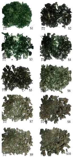 Figure 4 shows the photographs of synthetic air quenched slags. Overall, all air quenched slags were in the shape of irregular bulks and spherical grains with different sizes due to the simple air quenching process. The dark green color of slags is related to the ferrous iron in raw materials, which is observed in the blast furnace slag. The surface of air quenched slag is smooth, and the structure is dense with low porosity. As shown in Figure 4, the slags S1–S4 with the basicity CM/SA < 1.0 showed considerable transparent and glassy materials, while some opaque crystalline materials with an uneven distribution were formed in S5 and S6 whose basicity are around 1.0–1.05. For slags of S7–S10 with the basicity CM/SA > 1.05, only minor amorphous phase is visible and the slags are almost fully crystallized in a stone-like structure. During the cooling process, S8 and S10 showed bad fluidity and fast crystallization after taking out of furnace, which is due to the effect of high basicity for these slags. Based on above observations, it could be concluded that with the increase of CM/SA, the air quenched slags became opaquer and contained less amorphous phase.