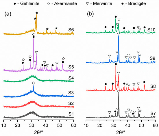 Figure 5 shows the XRD patterns of air quenched slags. In Figure 5a, an amorphous hump centered at 22–38° with almost invisible crystalline peaks is observed for S1–S4. The small diffraction peak in S3 shows minor content of crystalline phase akermanite. However, in the case of S5 and S6, the amorphous hump decreased obviously and there are many sharp diffraction peaks appearing, which reveals the considerable amount of crystalline phases. In Figure 5b, many peaks of crystals are observed for S7–S10 and the amorphous hump is not obvious. The main minerals in air quenched slags are gehlenite (Ca2Al(AlSiO7)), akermanite (Ca2Mg(Si2O7)) and merwinite (Ca3Mg(SiO4)2), while some bredigite (Ca7Mg(SiO4)4) was formed in S6.