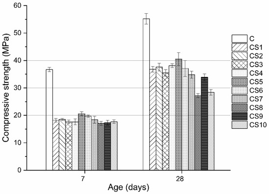 Figure 6 shows the compressive strength of slag blended mortars at 7 and 28 days. The mortars blended with air quenched slags showed overall lower compressive strength compared to the neat cement at both ages which is due to the relatively low reactivity of air quenched slag than the cement. At 7 days, CS5 and CS6 obtained slightly higher strength than those of other slag mortars with comparable strength ~18 MPa. At 28 days, the strength of all slag mortars increased and CS5 obtained the highest strength ~40.5 MPa. Compared to CS5, the mortars CS1–CS4 and CS6 achieved slightly lower strength, while CS7–CS10 had much lower strength, especially CS8 and CS10 clearly showed the lowest strength with only 27–28 MPa at 28 days. This strength difference among slag mortars could be attributed to the different chemical and phase compositions of air quenched slags. S5 with 60.3% amorphous content showed the highest strength. However, S6 with higher amorphous content (73%) and S1–S4 containing almost all amorphous phase showed slightly lower strength than S5. This suggests that only the amorphous content is not an effective indicator to measure the reactivity of slag. Air quenched slag with low amorphous content ~60% could also have good strength which was in agreement with other literatures [9,24].