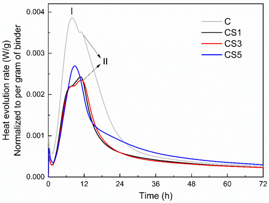 The heat evolution rate of slag blended pastes is shown in Figure 7. The first peak I appears ~7.5 h was primarily caused by alite hydration [38,39,40]. Then, an additional slight peak II was observed for the neat cement, CS1 and CS3 after the deceleration of alite hydration at ~11 h, which is associated with the secondary aluminate reaction upon sulfate depletion [25].