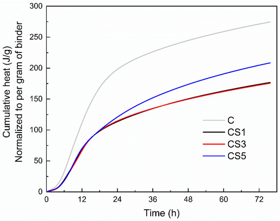 Figure 8 shows the cumulative heat of blended slag pastes at 72 h. The addition of air quenched slags evidently reduced the cumulative heat of blended pastes compared to that of neat cement. Higher heat evolution can be observed for CS5 than those of CS1 and CS3, while similar heats are released between CS1 and CS3. This indicates that S5 had higher reactivity than S1 and S3, which is consistent with the compressive strength results in Figure 6.