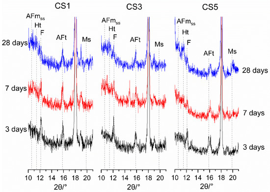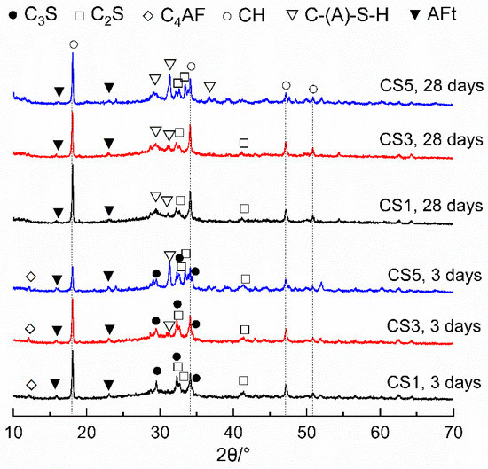 In Figure 9, the phases of C3S and C2S indicate the presence of residual cement. C3S presented at 3 days but disappeared at 28 days. Meanwhile, an increasing trend is observed for C-(A)-S-H and CH up to 28 days indicating the progressive hydration of slag pastes. At both ages, the CH peak for CS5 was slight lower than those of CS1 and CS3 which suggests the higher consumption of CH in CS5 due to the greater reaction of S5.