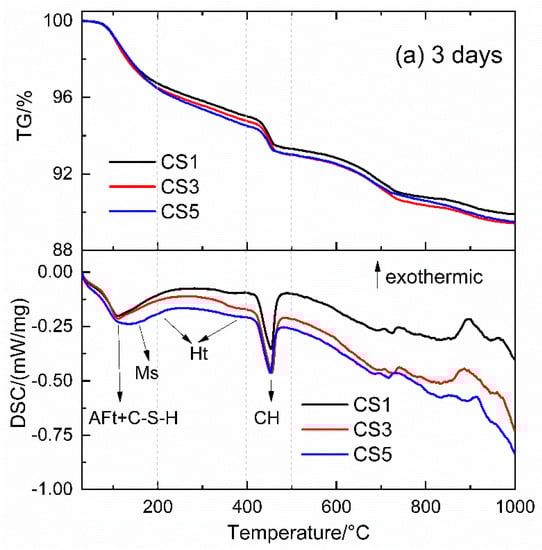 In the DSC curves (Figure 11), three main endothermic peaks are observed for all slag pastes. One peak located below 200 °C was related to the dehydration of C-(A)-S-H, AFt and Ms, the next small peak between 200 and 400 °C was about the dehydration of Ht. The other peak between 400 and 500 °C was due to the decomposition of CH [44]. For CS5, the peak located below 200 °C was wider and shifted to higher temperature than CS1 and CS3 at both ages. The widening of this peak indicates that more hydrates such as C-(A)-S-H, AFt and Ms were formed in CS5, especially clear Ms peak appeared in CS5 at 28 days. In the temperature range between 200 and 400 °C, the Ht peak for all slag paste was almost invisible at 3 days but at 28 days it was enhanced and CS5 showed more intense Ht peak than those of CS1 and CS3. This is in agreement with the XRD result in Figure 10.