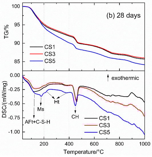 Figure 11 shows the TG-DSC curves of hydrated slag pastes at 3 and 28 days. The weight loss at 1000 °C for each slag paste is increasing due to continuous hydration and hydrates formation up to 28 days. The difference of weight losses at 1000 °C between pastes is small at 3 days but at 28 days it becomes larger for CS5 compared with CS1 and CS3.