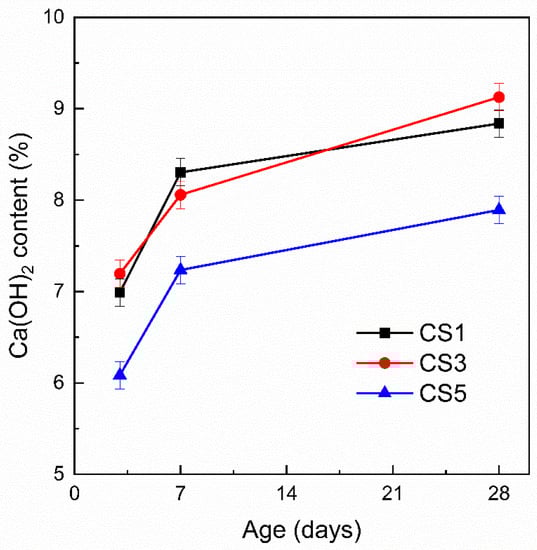The content of CH is usually used as an indicator of hydration degree of blended paste to estimate slag reactivity. A higher CH content means a lower consumption of CH, thus signifies the less reactivity of slag [45]. Figure 12 shows the CH content for slag pastes determined by TGA at different ages. CS5 gives the lowest content of CH at all ages than those of CS1 and CS3, while CS1 and CS3 show similar CH content with slight difference, which agrees with the CH peak evolution in XRD (Figure 9).