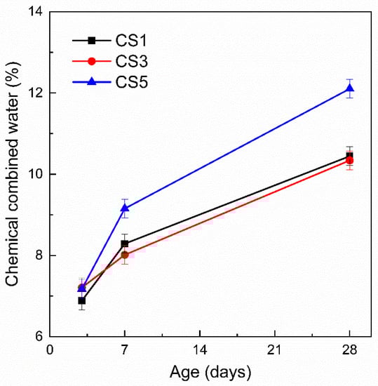 Moreover, the combined water content is also determined in Figure 13 to estimate slag reactivity [30]. Similar to the result of CH content, the combined water content evolution shows that there were more hydration products formed in CS5 after 3 days, indicating again the higher reactivity of S5 than S1 and S3.