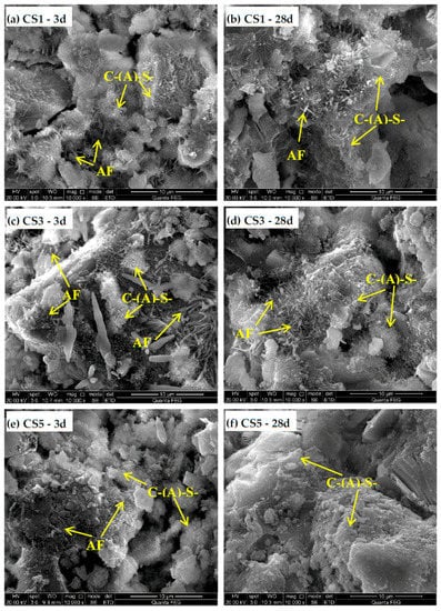 Figure 14 shows the SEM micrographs of hydrated slag pastes at 3 and 28 days. At 3 days, early signs of C-(A)-S-H and rod-like AFt appearing on the surface of grains indicates significant hydration of slag pastes. C-(A)-S-H with honeycomb shape and fine needle shape in small clusters had an independent discrete distribution. In the micrographs of pastes cured for 28 days, a considerable amount of C-(A)-S-H with the structure of honeycomb and fine needle shape mixed with rod-like AFt are still existed in CS1 (Figure 14b) and CS3 (Figure 14d). However, C-(A)-S-H in case of CS5 (Figure 14f) showed a connected and centralized structure with less pores, the typical rod-like AFt was almost invisible and there was an intimate mixture of hydrated phases. This resulted in the more homogeneous and compact matrix of CS5 than CS1 and CS3 at 28 days.