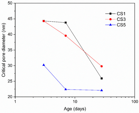 Critical pore size of hydrated slag pastes determined by nitrogen adsorption at 3, 7 and 28 days.
