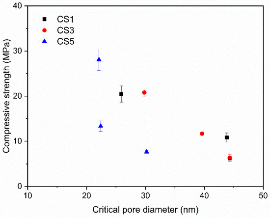In Figure 16 a correlation between compressive strength and critical pore size was plotted. The compressive strength showed a negative correlation with the critical pore size. This suggests that the smaller critical pore size of CS5 indicating a lower total porosity contributed to its higher compressive strength at 28 days.