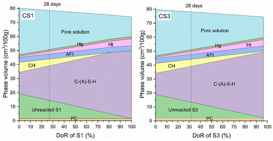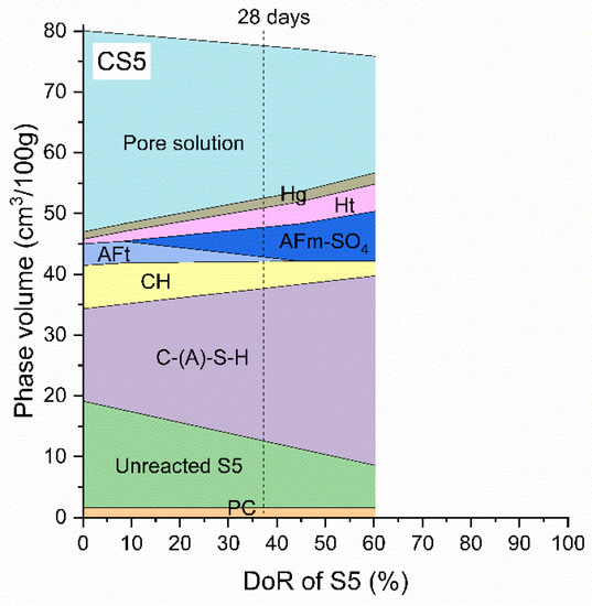 Modelled phase volume changes of slag blended pastes CS1, CS3 and CS5 as a function of DoR of slag by GEMS. Ht—hydrotalcite, Hg—iron bearing hydrogarnet, AFm-SO4—monosulfate, AFt—ettringite, CH—portlandite.