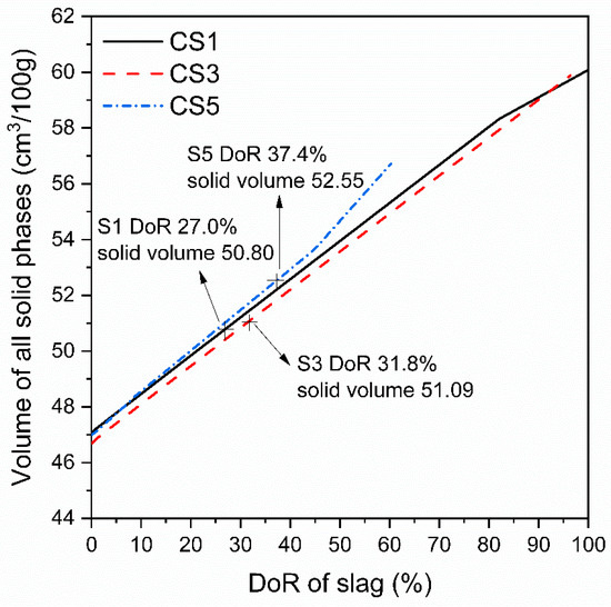 At a given DoR of slag less than 60% shown in Figure 18, CS5 always had a slightly higher volume of solid phases while S3 showed the lowest one. Figure 17 shows that the type and amount of hydrates formed in blended system vary significantly with different slags. This difference is mainly dependent on the chemical compositions of slag. It seems that air quenched slag with a low S/A ratio or rich in Al2O3 content could have higher reactivity and more solid phase volume. Moreover, the experimental hydration of slag blended pastes was also found to be strongly influenced by slag composition, most likely S/A of slag. The blended paste containing slag with a lower S/A ratio was observed to show more hydration heat release, higher CH consumption, greater chemical combined water amount and denser structure. However, no clear effect was observed for the hydration of slag paste with the changing of CM/SA and C/M ratios. This is consistent with the regression analysis results of compressive strength shown as Equations (2) and (3), implying that among three chemical composition ratios S/A of slag shows the most significant impact on slag reactivity, hydration and strength development.