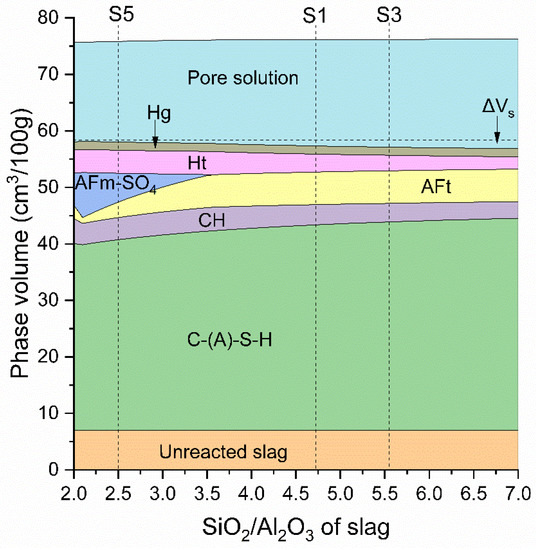To further explain the effect of S/A ratio, the modelled hydrated phases of slag blended paste changing with the S/A ratio of slag is shown in Figure 19. The model assumed the complete reaction of cement and 60% reaction of slag, which corresponds to the hydration situation after roughly 180 days or later. As observed in Figure 19, increasing the S/A ratio from that of S5 (S/A 2.49) to S1 (S/A 4.72), then to S3 (S/A 5.55) leads to the removal of AFm-SO4 phases (Ms and AFmss) at S/A around 3.6, whilst increasing the volume of the C-(A)-S-H and AFt phases, slightly decreasing Ht phase and the total hydrate volume (seeΔVs increases). The decrease in hydrate volume would result in the increase of porosity and thus reduce the compressive strength. This explains the difference in pore structure and strength results (Figure 6 and Figure 16) among blends containing S1, S3 and S5. Besides, it should be noted that this modelled phase volume changes (Figure 19) only reflect the influence of chemical compositions of slag, no kinetic effect of the three slags was considered. The difference in strength of slag blends was also attributed to the effect of hydration kinetics of slags as discussed in Table 7 and Figure 18.