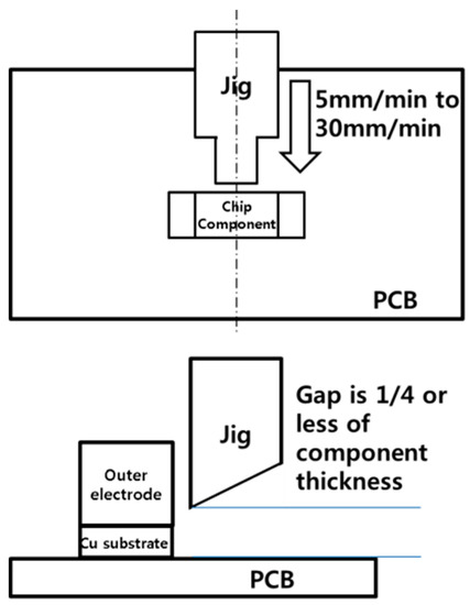 Following fabrication of the specimens, the solder joints were aged in a thermal chamber at 85 °C, 125 °C and 150 °C for 21 days (504 h) following the JESD22-A103C standard [25] (i.e., high-temperature storage life). Shear forces were then measured to determine the effect of the GNSs on the bonding characteristics of the solder joints. The shear forces were tested using a JIS Z 3198-7, which operates at a shear speed of 5–30 mm/min and a height that is 25% or less of the component thickness (Figure 2). We measured shear forces at a shear speed of 10 mm/min and a height of 100 µm (0.1 mm) from the Cu substrate. Finally, the solder joints were cross-sectioned, polished, and etched for 30 s with 10 vol % hydrochloric acid in ethanol in order to observe the IMC layer in the solder joints. The thickness of the IMC layer was measured based on SEM images, with the average of the maximum and minimum thickness for each specimen used in the analysis.