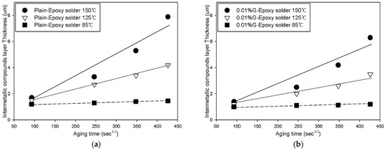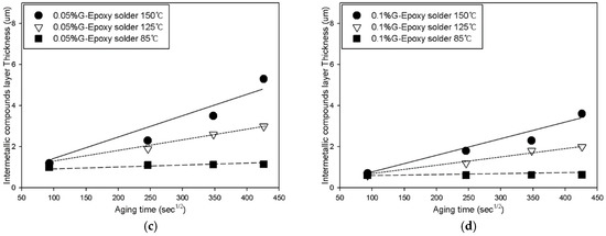 - Growth of the Cu–Sn IMC layer at the solder/Cu substrate interface due to Sn and Cu atomic diffusion was confirmed with aging tests at 150 °C, 125 °C, and 85 °C. It was found that the IMC layer was suppressed by the addition GNSs to the solder. Under the harshest conditions (isothermal 150 aging for 21 days), the thickness of the IMC layer was 7.9 µm in plain epoxy solder, 6.3 µm for the 0.01%-GNS solder, 5.3 um for the 0.05%-GNS solder, and 3.6 µm for the 0.1%-GNS solder.