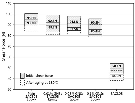 Shear forces were assessed to investigate the effect of GNSs on the bonding characteristics of the solder joints (Figure 7). The initial shear force was 95.6 N, 92.6 N, 91.8 N, and 90.2 N for the plain epoxy solder, 0.01%-GNS solder, 0.05%-GNS solder, and 0.1%-GNS solder, respectively. The conventional SAC305 (i.e., without epoxy) solder joint had a shear force of 50.1 N. The GNS-containing solders had a lower shear force than the plain epoxy solder, with the 0.1%-GNS formulation exhibiting the lowest force. However, the shear forces for all of the epoxy solder formulations in this study (i.e., plain, 0.01%-GNS, 0.05%-GNS, and 0.1%-GNS) were almost twice as high as conventional SAC305 solder joints.