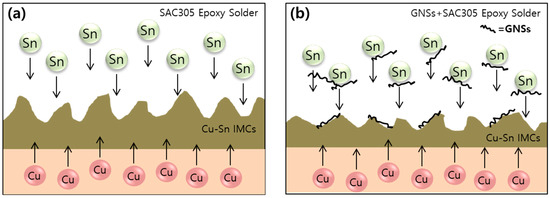 Schematic diagram of IMC growth in (a) SAC305 epoxy solder joints and (b) GNS/SAC305 epoxy solder joints.