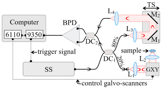 The interferometer configuration employs two directional couplers, DC1 and DC2. DC1 has a splitting ratio of 20/80, while DC2 is a 50/50 balanced splitter that feeds a balance detection receiver balanced photo-detector (BPD) (Thorlabs, Newton, NJ, USA, model PDB460C). In the sample arm of the interferometer, the beam was collimated by the achromatic lens L1 (focal length 15 mm), and conveyed towards a scanner head GXY made of two orthogonal galvanometer scanners (Cambridge Technology, Bedford, MA, USA, model 6115) and focused on the sample by the scanning lens, L2, (25 mm focal length). The optical power onto the sample was 2.2 mW, while the optical components in the sample arm determined a lateral resolution of 10 µm. The reference arm consisted of two collimating lenses, L3 and L4, both similar to L1, as well as two flat mirrors (M1 and M2) placed on a translation stage (TS). By adjusting the position of the TS, the optical path difference (OPD) in the interferometer can be adjusted.