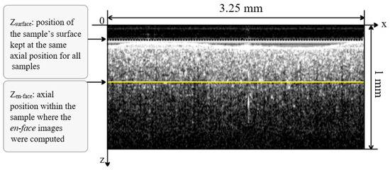 The surface considered at the depth of zen-face = 0.375 mm is capable of providing a good reflectivity signal in order to characterize the granulation in the en-face OCT image acquired from inside the material. The larger the depth, the less the signal backscattered due to the absorption and scattering in the sample. The depth of zen-face = 0.375 mm was selected as a compromise between the loss of signal and the granulation dependence on the curvature of the top surface. We thus ensured, as the optical power on the sample was kept constant, that any change in the image brightness of the sample was only due to the changes in its optical properties, and not to the differences due to the different investigation depths inside the samples or to the shape of the teeth prostheses if the investigations were made at their (uneven) surface.