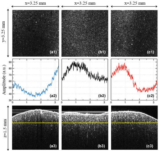 From all of the three groups, it can be concluded that the B-scan images of all of the samples are much less relevant from the point of view of the assessment of the sintering temperature variations (Figure 4(a3,b3,c3)). The same conclusion can be reached for the A-scans, that is, for the reflectivity profiles along the depth (z-axis). In this respect, our study demonstrated that only en-face OCT images allow for the proposed assessment.