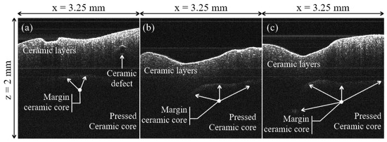 Examples of OCT B-scans/cross-sections of samples from the three groups considered in the study: (a) Group L; (b), Group N; (c) Group H. Material defects and margins of the pressed ceramic core can be remarked.