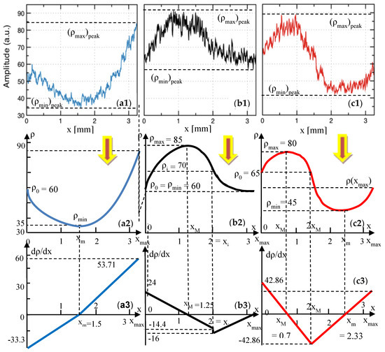 The first portion of this group’s curve ρ(x)—Figure 7(a2)—has a parabolic function, given by Equation (A1). Constants a, b, and c are obtained using the conditions from Figure 7(a2), as follows: