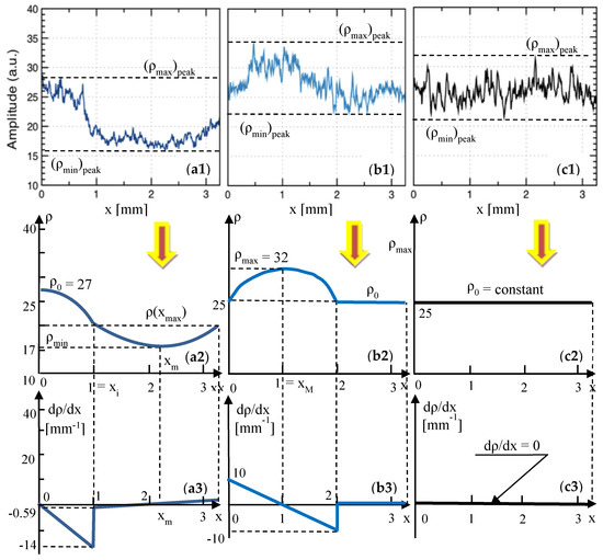 It can be seen from the profile of the ρ(x) curve in Figure 6(c2), that its first portion has a parabolic function similar to Equation (A1), with constants a, b, and c given exactly by Equation (A8), as the conditions (A7) are the same. The values of the constants are different; using the parameters in Figure 6(c2), one has the following: a = −30.61 mm−2; b = 42.85 mm−1; c = 60. Also, from Figure 6(c2), f(0) = ρ0 = f(xi) and f′(0) = −f′(xi) = 42.85 mm−1.