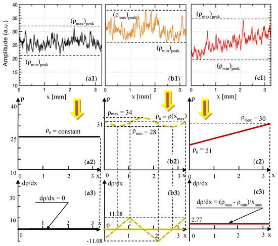 The analytical expressions of these two functions—and therefore of ρ(x)—are obtained for each Group, in Table 1, Table 2 and Table 3, respectively, as well as for the gradients of the reflectivity dρ/dx and the second derivatives d2ρ/dx2. The gradients are also shown in Figure 6(a3,b3,c3), for the considered parabolic functions.