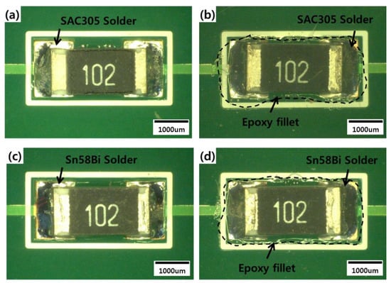 The specimens to be tested were prepared using R3216 chips (Figure 1). R3216 chips offer a general resistance function, consisting of resistive structure coated with a covering layer (Ag) and a termination (Ni barrier). First, the R3216 chips were reflowed onto a printed circuit board (PCB) with either SAC305 (wt.% 96.5Sn3.0Ag0.5Cu) or Sn58Bi (wt.% 42Sn58Bi) solder, which is a low-temperature lead-free solder. The PCB had been finished with an organic solderability preservative. In addition to these control specimens, two types of epoxy solder were used to fabricate the experimental specimens, created by stirring epoxy into either SAC305 or Sn58Bi solder. Epoxy solder must be reflowed at a higher temperature than conventional solder. Melting point of conventional SAC305 solder paste is 221 °C, and that of Sn58Bi solder paste is 139 °C, so the SAC305 epoxy solder was heated to 240 °C for 100 s and the Sn58Bi epoxy solder was maintained at 180 °C for 140 s to facilitate the bonding process. The epoxy was then cured at the outer edge of the solder joint. Each specimen were prepared 18 pieces for test uniformity.