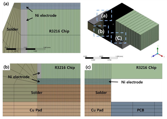 FEA modeling was conducted based on R3216 chips. As shown in Figure 2, the model was simplified by modeling 1/4 of the actual chip size (L: 3.2 mm, W: 1.6 mm, H: 0.5 mm), taking advantage of the symmetry of the package. The overall model consisted of a Cu pad, a PCB, a R3216 chip, a Ni electrode, layer, and a solder joint. The R3216 specimen consisted of a 10-μm Ni plating layer on the outer side of a ceramic chip of alumina (Al2O3), forming an electrode. The thickness of the Cu pad was 30 μm, and the actual measurement value was used. The PCB was modeled by dividing it into five parts to facilitate mesh construction. Solder joints were modeled between the Cu pad and the chip to reflect the final shape of the assembly. In order to conduct FEA, the modeled shape was divided into element types. The thickness of the Ni electrode was modeled as 10 μm. For the thin and plated films, element convergence can be increased by dividing them into node elements with a minimum of five layers. Because this is directly related to the accuracy of the FEA, the solder joints, Ni electrodes, and Cu pads were divided into more than five layers. In addition, components with a large volume, such as the solder joints, were divided into a large number of ellipses to prevent an excessive number of ellipses. The mesh image of the 3D model used in this experiment is presented in Figure 3. Each specimen model was divided into approximately 390,000–410,000 elements.