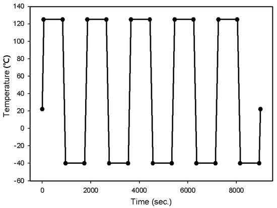 The heat generated when using the chip was simulated using FEA. In consideration of this, thermal shock temperatures were applied to the chip as shown in Figure 4. The temperature started and finished at 22 °C (i.e., room temperature), cycling up to 125 °C and down to −40 °C five times, with a 2-minute ramp time and a 15-minute dwell time at each temperature. One cycle thus lasted 30 minutes.