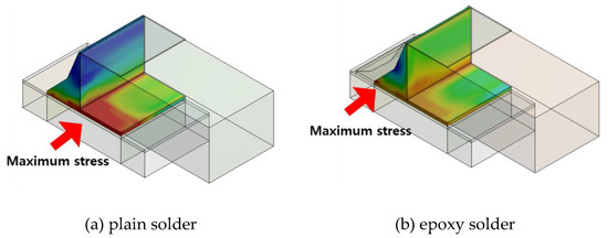 (1) The FEA found that thermal stress in the conventional solder joints primarily formed at the bottom of the chip. For the epoxy-containing solder joints, maximum stress was observed at the top of the solder joint, with no maximum stress generated in the Cu pad/solder/Ni layer. The reason for this is that the high mechanical properties of the epoxy material supported the outside of the solder fillet, dispersing the stress in the solder joints.