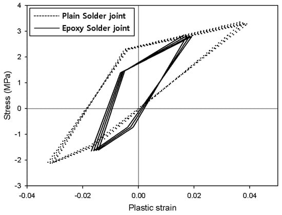When thermal loads are applied, the materials undergo thermal expansion. At this time, thermal stress and heat deformation increase at the solder joint. Creep is generally observed when a test specimen is held at high temperatures [23,24,25,26]. However, creep at high temperatures was not observed in this specimen due to the shape and thickness of the solder joint. As the specimen moved into the low-temperature region, the stress-plastic deformation inside the solder decreased. Because the temperature was lowered to −40 °C, the solder joints experienced compressive stress and formed a hysteresis loop (Figure 6). This cyclic hysteresis loop gradually reduced in size each time the cyclic load was applied and can be used as the basis for analyzing fatigue failure. Figure 7 presents the hysteresis loops for the Sn58Bi solder joint; it is clear that they are smaller than the SAC305 solder hysteresis loops.