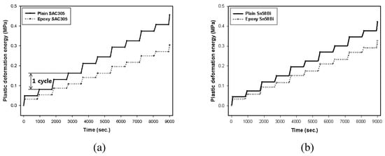 Accumulation of plastic deformation energy during testing: (a) SAC305 and (b) Sn58Bi solder joints.