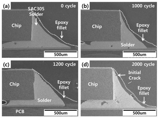 Cross-sectional images of the fabricated specimens were taken to compare actual crack propagation in thermal shock tests with the life prediction of solder joints calculated using FEA. The cross-sectional images were taken using scanning electron microscopy every 300 cycles during thermal shock testing. All of images of specimens were checked, and the average tendency images were used for analysis. No cracks or other damage were observed in the initial solder joints. During thermal shock testing, cracks were observed in the conventional SAC305 solder joints after 1200 cycles (Figure 9). These cracks expanded into the inner portion of the solder joint as the cycles continued. As shown in Figure 10, cracks in the epoxy SAC305 solder joints were observed after 2000 cycles, which closely followed the FEA results. Generally, the cracks in the conventional solder joints started in the solder under the chip and propagated to the solder fillet or the solder/Ni layer interface. However, if solder joints were bonded with epoxy, the cracks formed in the chip corners. The difference in the crack starting point can be explained by epoxy fillet effects. The epoxy fillet that formed on the outer region of the solder reduced the strain arising from the CTEs and lowered the thermal stress at the finished end of the solder joints. Thus, the cracks started in the inner region of the solder joints.