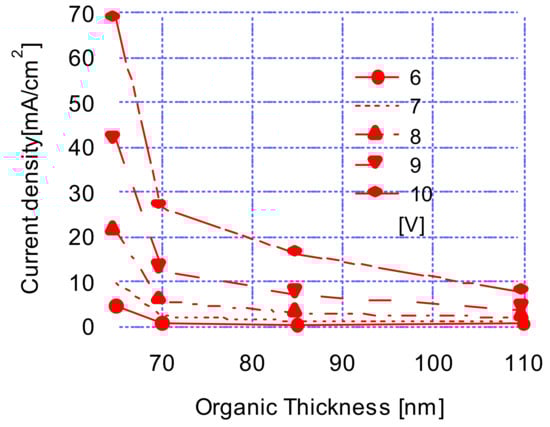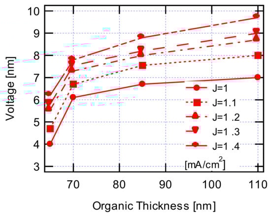 Current density characteristics as a function of organic thickness (emission layer and hole transport layer) at various operating voltages.
