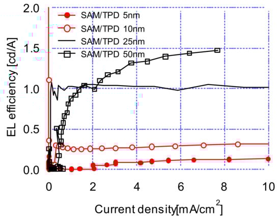 Figure 4 shows the luminance characteristics of OLED devices according to the applied current densities. As shown in Figure 4, the luminance efficiency was improved with an increasing TPD thickness, which was in contrast to the current density-voltage characteristics of Figure 1, where the current densities increased with decreasing TPD thicknesses. Thin TPD was more efficient in the hole transport as compared to the electron transport. This kind of unbalanced carrier transports created an inefficient luminance at a thin layer of TPD. On the other hand, there was improved luminance efficiency with a thick TPD layer because of the balanced transports of electrons and holes through the transport layer. This suggested that it is crucial to optimize the carrier transport layer thickness to obtain an efficient luminance and a low operating voltage.