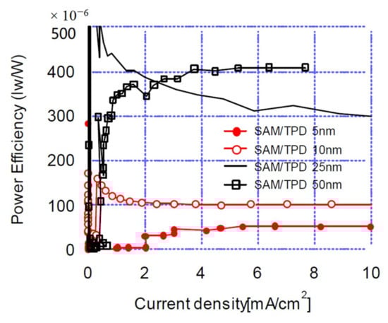 Power efficiency-current density characteristics of OLED devices at 5, 10, 25, 50 nm TPD thicknesses.
