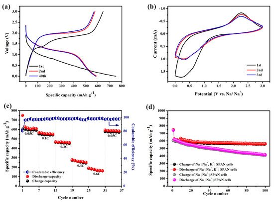 A typical cyclic galvanostatic discharge–charge curve of the hybrid Na+/K+ battery is presented in Figure 2a. During the first cycle of the discharge process, the specific capacity was measured to be 750.1 mAh g−1, i.e., 1875.3 mAh gsulfur−1. It is reported that there is a complicated activation process between rearranged sulfur atoms and C–S bonds during the first discharge process of a sulfur-based cathode [20], which could explain why the following cycles exhibited a lower specific capacity than the first cycle. According to Figure 2a, the voltage plateau of the first discharge (~1.0 V) was lower than that during the subsequent cycles (~1.5 V), with a longer discharge process, indicating the slow activation reaction of the first discharge process. During the first cycle, the decrease in the specific capacity and the change in the voltage plateau indicated that an irreversible transformation process might have occurred in the SPAN composite during the first discharge process. The irreversible capture of minor potassium ions and electrolyte decomposition might have resulted in the generation of a solid electrolyte interface (SEI) film during this process. After the second cycle, the Na+/K+ hybrid battery presented an excellent coulombic efficiency close to 100% with a highly reversible discharge–charge capacity of 592.3 mAh g−1 for up to 40 cycles.